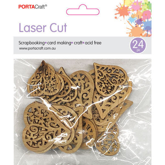 This Laser Cut Filigree Hearts 27x29mm 24pk is a delightful assortment of intricately designed wooden embellishments perfect for adding a touch of whimsy to your craft projects.
